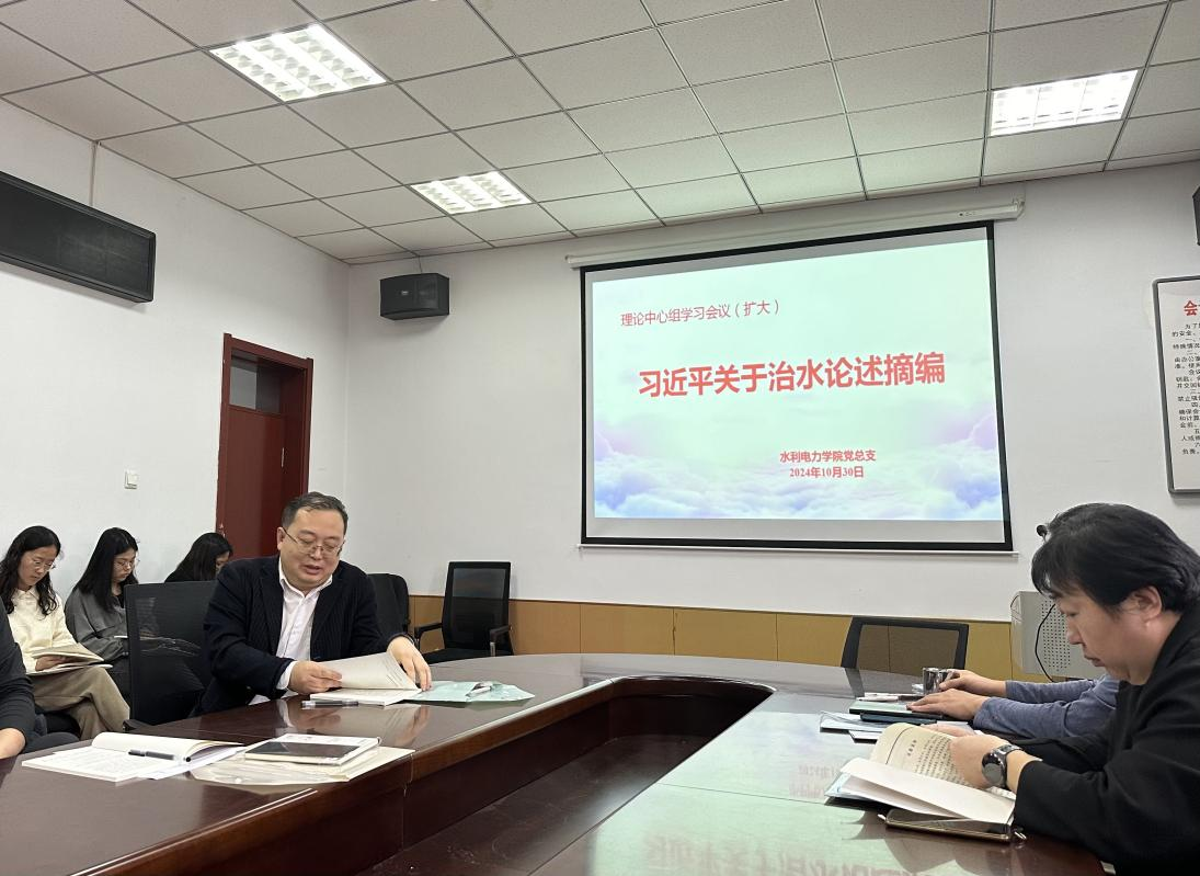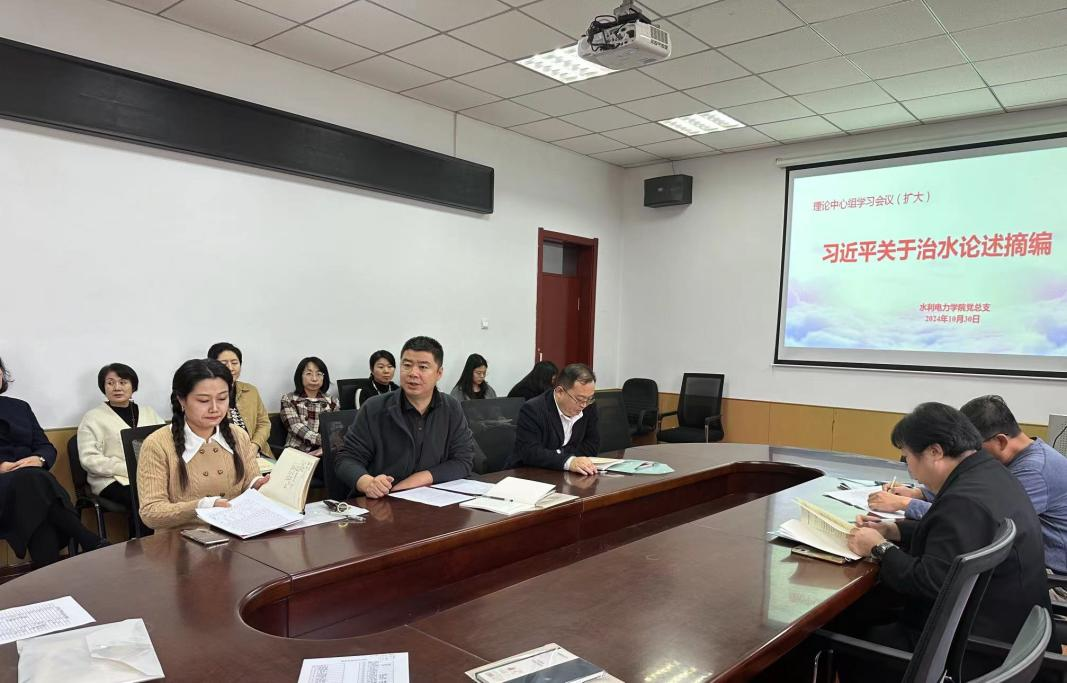 10月30日下午,水利电力学院党总支召开理论学习中心组(扩大)会议,专题学习《习近平关于治水论述摘编》。学院党总支理论学习中心组成员、全院教师参加会议,会议由学院党总支书记刘春明主持。