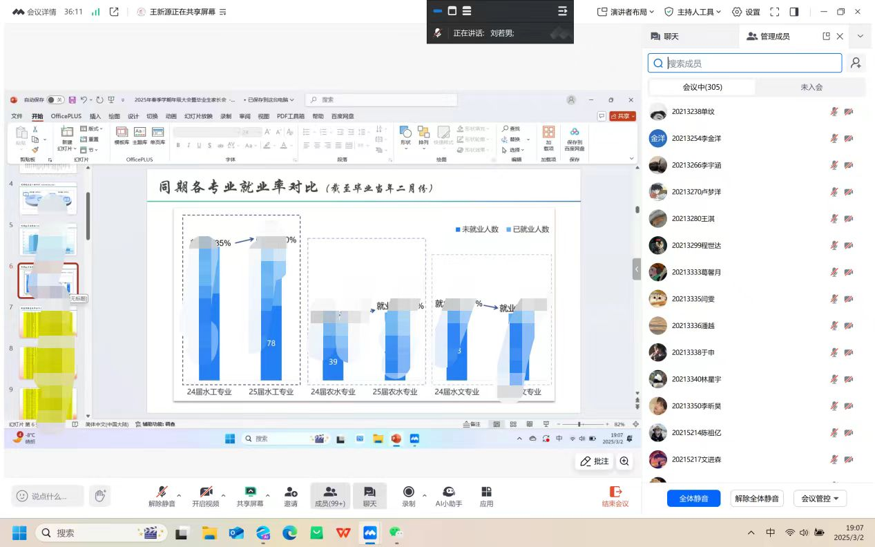 首先,刘若男以详实数据为支撑,通过学校整体阶段性就业数据通报、同期就业总人数对比、各专业就业率对比、校园招聘应届毕业生情况、研究生推免情况以及研究生报考人数及初试统计等情况,详细介绍了学院2025届毕业生目前的就业状态,全面分析了当前就业形势,并针对年级就业、升学、考公等不同类学生人群进行现状分析,提出对策建议。她表示,2025年就业形势较为严峻,岗位竞争尤为激烈,部分企业岗位需求大量缩减,学生和家庭层面,应充分整合各类资源,设立明确可行的升学或求职目标。她强调,毕业生在认真进行毕业设计的同时密切关注本专业就业工作动态,主动与老师们沟通联系,家校齐心,合力育人。