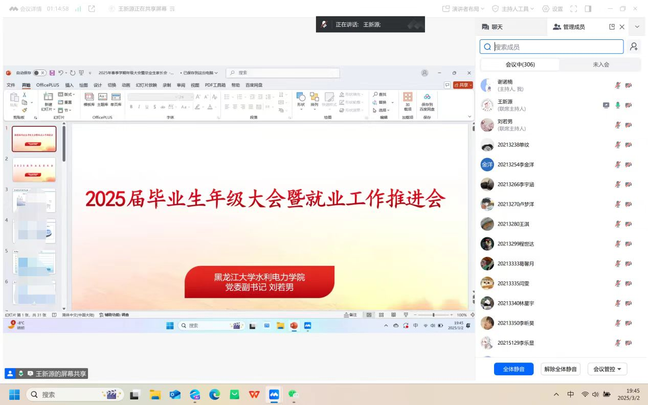 为切实做好2025届毕业生就业指导工作,进一步加强家校协作,凝聚育人合力,共同推进2025届毕业生就业工作,推动毕业生多元化、高质量就业,水利电力学院于3月2日召开2025届毕业生家长会暨就业工作推进会。会议由2025届毕业生辅导员王新源主持,学院党委副书记刘若男主讲,全体2025届毕业生参加。